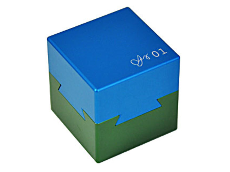 This elegant metal cube invites you to separate the two halves. However it is not as easy as it might appear. All four sides have an identical looking dovetail joint, which would suggest that separating the two halves is impossible!