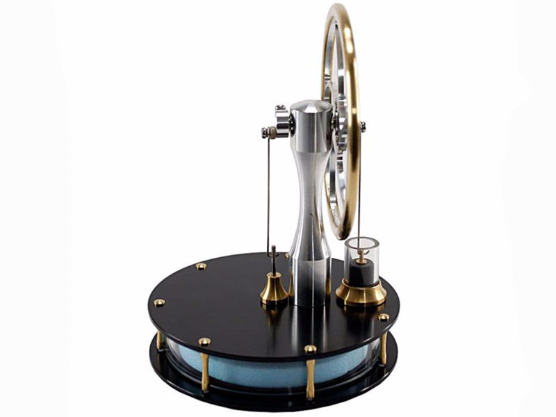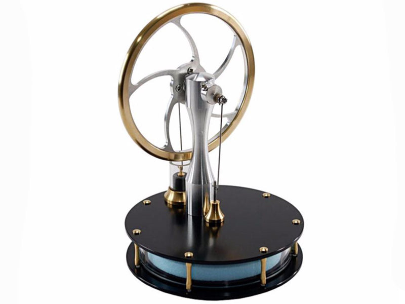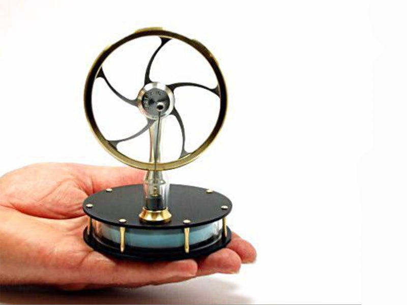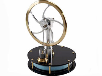 One spin of the flywheel and this Low Temperature Stirling Engine shows a clean and simple way of converting thermal energy into motion. This engine will operate from many heat sources, including hot water, computer monitor, TV and the human hand. As long as there is a small difference (about 10 degrees) in temperature between the upper and lower plates this engine will run. The ready assembled engine is supplied in a rigid black card tube, approximately 160mm diameter and 200mm tall. This Low Temperature Stirling Engine has black anodised aluminium top and bottom plates. Aluminium has excellent thermal properties, and conducts heat very efficiently.