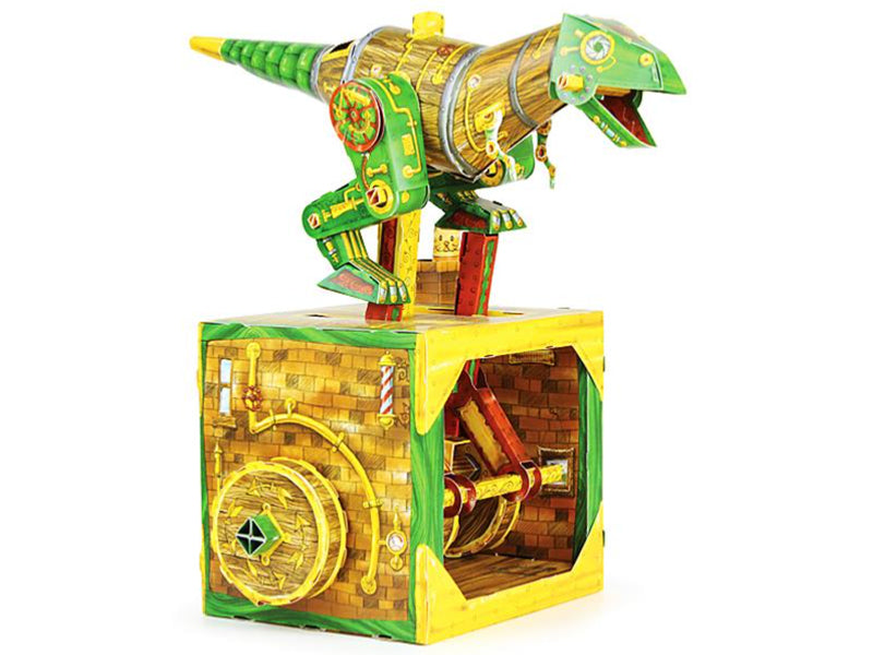The Totally Glueless Magnificent Dinosaur Machine is an automaton – a moving machine. The kit comes in a box with everything you need to get it working. Push out the pieces from the frame and slot them together by following the instructional poster. No glue required! Once assembled, turn the handle to watch the Dinosaur walk and ROAR! Darwin the cat gets a bit scared by the roar and disappears down the chimney.