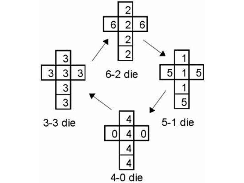 Proceeding clockwise around the circle, the dice with the 6's and 2's on it, called the 6-2, will beat the 5-1, the next in the circle, which in turn beats 4-0, which beats 3-3... WHICH IN TURN BEATS 6-2! Your advantage is that you will win 24 times out of 36 - that is 2 times out of 3, or a 66% advantage. So whichever dice your opponent selects - and asking someone to choose first is part of the strategy - you take the next dice backwards in the circle.