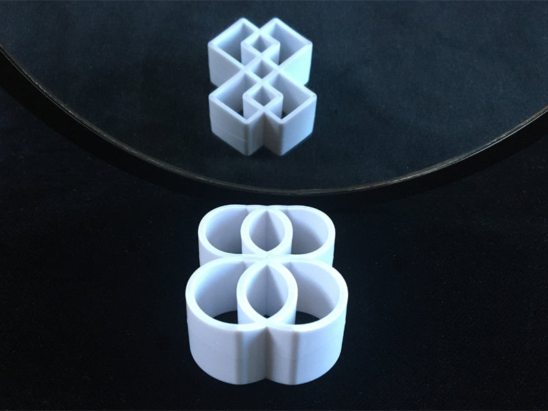 Rounding Square from one angle looks like four overlapping circles. Viewed from the opposite direction, it looks like four overlapping squares. If you place the object on the table and position a mirror behind it, you can see both shapes at the same time!