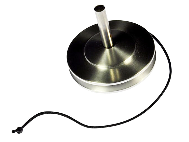 Wind the string firmly around the body of the top. Place the steel pin in the hole, and place the top upright on a flat surface. Holding the pin firmly in one hand, with the other hand pull the string in order to set the top spinning. You can then lift the steel pin out, leaving the top spinning on its own. The top should run for 5 or 6 minutes. Maybe, if you find the perfect equilibrium, even longer...