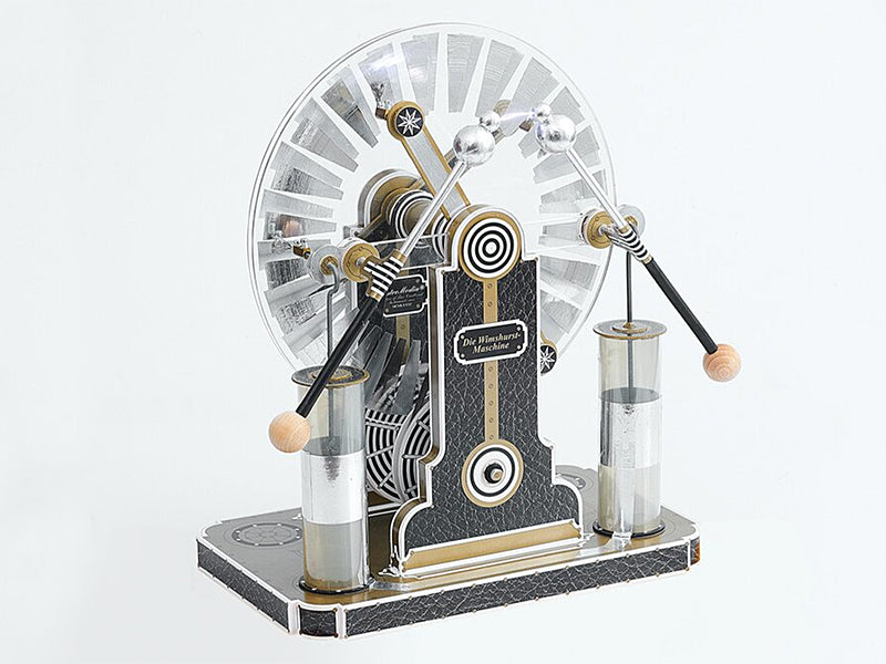 This high quality cardboard construction kit allows you to build your own version of the classical high voltage generator - with limited current for safe experiments! For many people this machine is the most vivid memory of their physics classes at school. Everybody is fascinated by the crackling flashes of lightning that appear between the electrodes when the crank on the back is turned. Two counter-rotating acrylic discs with aluminium segments produce static electricity of up to 70,000 volts that is stored in two Leyden jars made from PVC and aluminium foil. The Leyden jars are discharged via two spherical electrodes, producing bright sparks. The capacity of the Leyden jars is deliberately limited, so that the electricity produced is completely harmless.