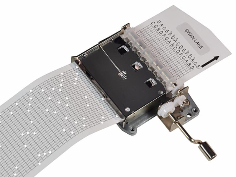 The 30 Note Music Box Set comes in a plain white box. Inside the box is the Music Box itself, one pre punched strip which plays the theme from Swan Lake, one blank strip, and a hole punch. The Music Box weighs 280 grams, and is 108 mm wide (150 mm wide including the handle), 70 mm deep, and 30 mm high. When packed in the box, with the hole punch and blank strips, the weight is just over 400 grams. There is an important point to make, if you are planning to combine the music box with other instruments. The notes that are marked on the paper strip, i.e. G, A, C, are NOT the notes that the music box actually plays, if you compare it with the notes on a piano. So the line marked F# on the music box plays back as a B, G# plays as a C#, etc. As well as a fun way to learn about music, there are also some serious musicians out there who are using the music box, including Hannah Peel. There is also an app that has been written that allows you to test out new songs and compositions, and when you are happy with the result, you can print out a guide to help you punch out the paper strip.