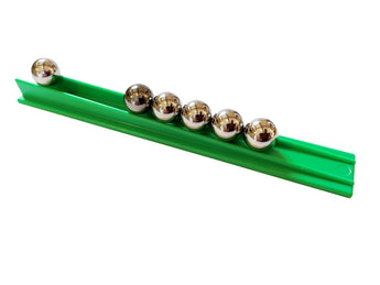 Why is it called the Gaussian Gun? Well, no reason really, except that a friend of ours just christened it that, and the name seems to have stuck. It is really very simple, which is why we like it! A plastic channel supports the row of 4 ball bearings, and a spherical neodymium magnet. At first sight, it looks like 5 ball bearings!