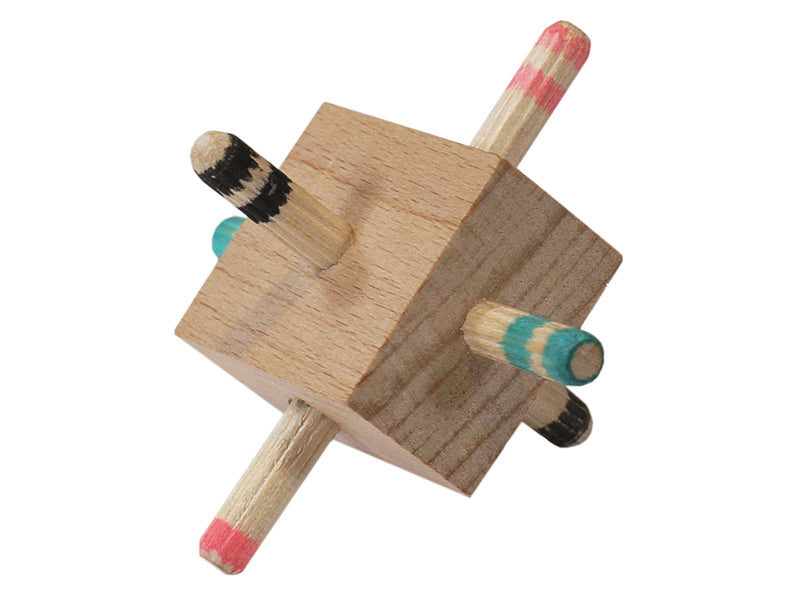 This deceptively simple little spinning top exhibits some very unusual behaviour. A rectangular wooden block forms the main part of the top, and each of the three sides is of a different length. This fact is important and is the key to the way this top behaves.