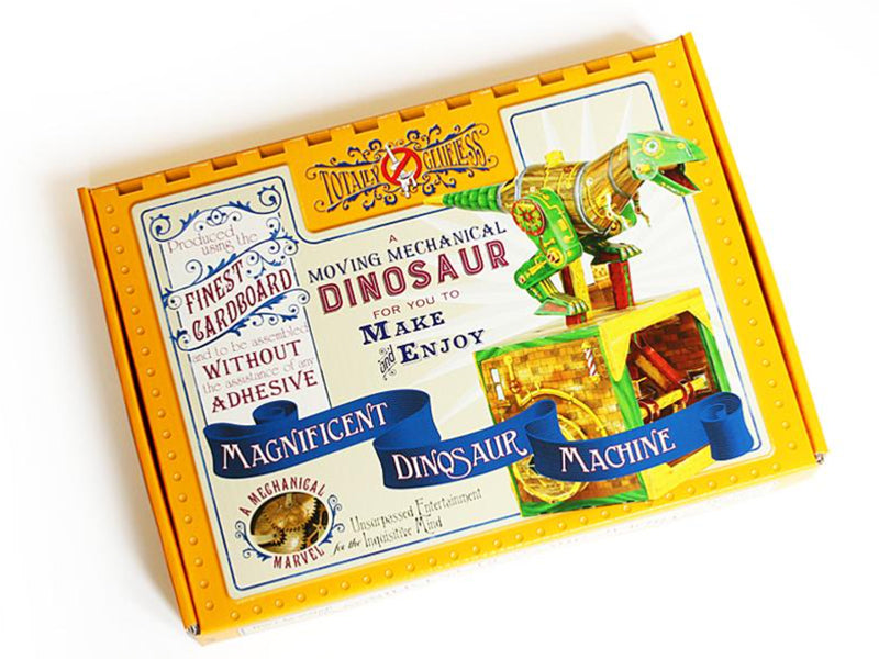 The Totally Glueless Magnificent Dinosaur Machine is an automaton – a moving machine. The kit comes in a box with everything you need to get it working. Push out the pieces from the frame and slot them together by following the instructional poster. No glue required! Once assembled, turn the handle to watch the Dinosaur walk and ROAR! Darwin the cat gets a bit scared by the roar and disappears down the chimney.