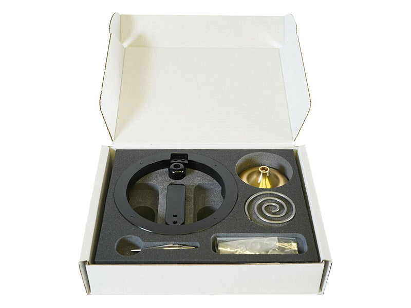 In this design the stem will trace along the edge of a metal spiral, clinging to it like a magnet - but magnets are NOT involved here. The key to this design is to make the contact point/tip of the top at its own centre of mass, then any frictional force in contact with the stem will produce a torque about the contact point at right angle to the direction of friction that creates the stabilizing force (students of physics may recognize application of the right hand rule here). An extreme physics toy!
