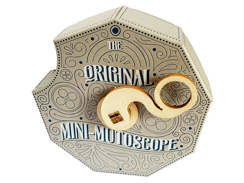 The Mutoscope is a 19th Century invention - basically it is a mechanical flipbook containing frames of animation which flip through at speed when you crank the handle. This tricks the eye into seeing motion, the same effect as a flipbook! Larger versions of these devices were sometimes installed on the pier at seaside towns, and referred to as 'What The Butler Saw' machines. You had to put a coin in to make it work.