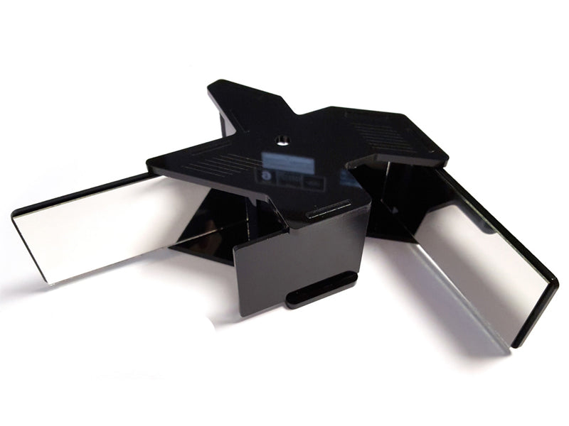 The main body of the Pseudoscope is made of pieces of laser-cut acrylic. The 4 mirrors are already cut to size, and come complete with double sided sticky pads, so no glue is needed. There is a tripod/screw adaptor. Also in the box is a expanding sphere and a memory foil wand, which together act as a 'Pseudoscopic target'. Plus a set of instructions.