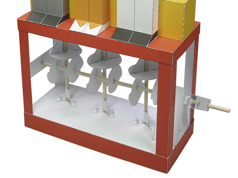 This paper machine kit contains three construction sheets printed with the model parts, kebab and cocktail sticks, and fully illustrated step by step instructions. The model requires scoring, cutting, folding and glueing. Items you will need to provide - a pair of scissors, a craft knife, a ruler, and glue (white school glue is fine).